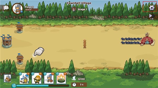 2、成功进入关卡后,在界面的左侧下方,分别是你可用的队伍,蓝色条能是你的能量,不同队伍的招募需要对应的能量才能进行,比如炮兵需要4格、弓箭手需要3格、地雷需要2格、骑兵需要3格,后续玩家还能解锁更多兵种。关于放置,只要满足一定的能量后,拖动屏幕上的兵种到战场上即可。