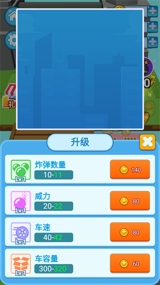 3、通过出售方块资源获得的金币可以用来升级自己的运输工具,提升炸弹数量、威力、车数以及车容量。
