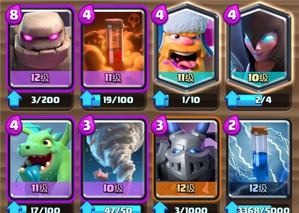 1、玩家可以从自己的牌库中选择8张卡牌来组成玩家自己的“出战卡组”,玩家最多可以保存三套出战卡组,然后选择一套想要出战的卡组。在对战界面点击“对战”搜索对手,匹配系统会为玩家搜寻与玩家奖杯数相近的其他玩家,玩家拥有的卡牌数等级并不会影响对战匹配。