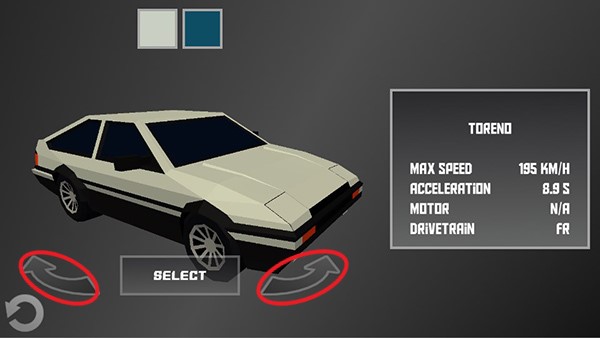 之后玩家就可以选择车辆啦,点击下方箭头可以切换车辆,上方颜色框可以切换车辆颜色,选择完点击RELECT即可开始赛车。
