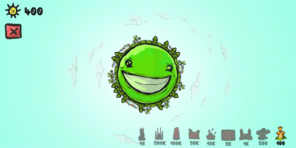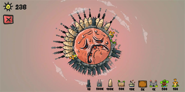 一开始地球是可爱的绿色风格,蓝天白云小鸟鲜花啥都有,就像刚诞生不久的样子。但随着你不断建造各种建筑来获取资源,地球就开始慢慢变色了,先是变黄变暗,后来甚至变成了灰褐色,整个画面看着都让人压抑。特别是到最后阶段,地球完全变成了一副“老年”模样,满脸皱纹,表情痛苦,最后直接走向死亡。