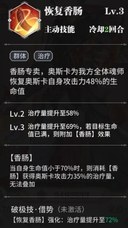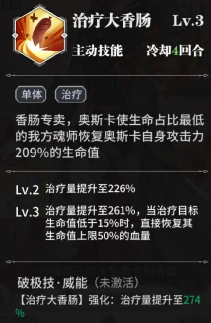 ●二技能:使生命值最低的友方魂师恢复奥斯卡攻击力百分之二百二十二的生命值。