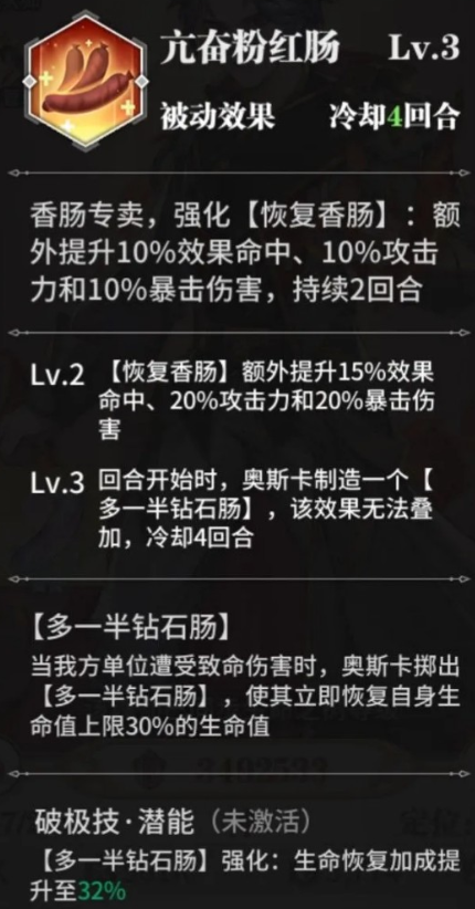 ●四技能:恢复香肠强化:额外提升百分之十的效果命中和百分之十的暴击伤害,持续两回合。
