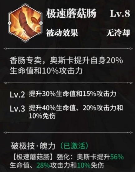 虽然一技能系数加成低,但是有香肠的作用下,可以在血量低于70%的情况下,自主回复奥斯卡的攻击力35%的血量,加上4技能的攻击加成,乍一看还是可以的。