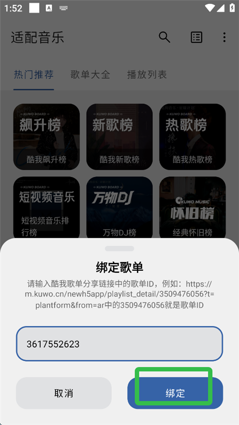 5、将刚才的歌单id复制过去,点击绑定即可。