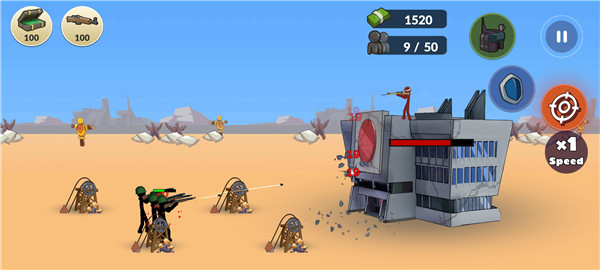 1、游戏中有超多不同属性的火柴人等你来操控,参与不同的战斗,建造自己的基地;2、从机关枪、火焰喷射器、大炮和坦克中组建最强大的火柴人;