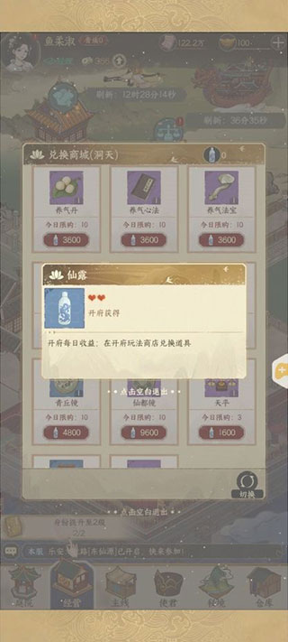 在兑换商店中,可以使用“仙露”道具兑换各种消耗道具。