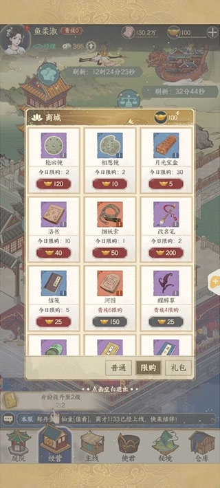 元宝商铺分为“普通”“限购”“礼包”,使用元宝可购买相应的道具物品。