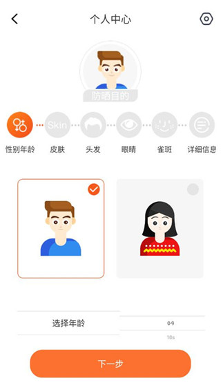 1、点击个人中心,选择个人皮肤情况以及防晒目的