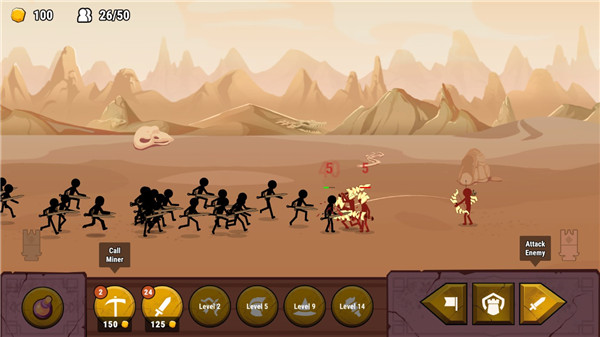 1、各种火柴人角色:矿工,剑,巨人,弓箭手。2、大量的棍棒武器,能够增加你的部队火柴人的力量。