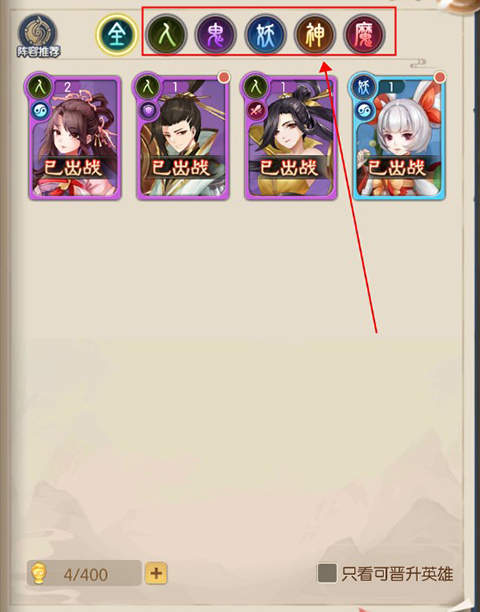 3、英雄阵营还存在克制和光环关系,人、鬼、妖之间相互克制,神魔之间互相克制,同时上阵同族英雄还能激活阵营光环,获得额外属性加成。