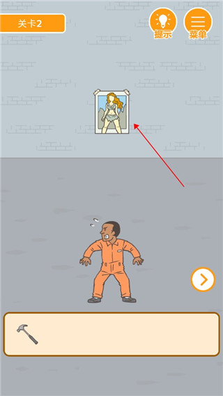 2、第二关,切换场景,拿到锤子后,点击海报将它移开,把锤子拖动到裂缝上砸开墙壁。