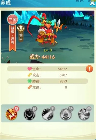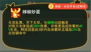 最后的合击技能辣椒炒蛋,与貂蝉出战触发对敌军全体造成280%伤害,并恢复造成伤害的40%生命,释放技能后3秒内自身霸体且增加攻击防御命中。比主动技能还要厉害,必带貂蝉进行触发。