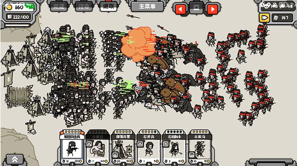 4、现在无人口上限,升级原始人到1个金币,死亡得一个金币,几率召唤两个兵,等于无限兵加刷金币,轻轻松松通关无尽。
