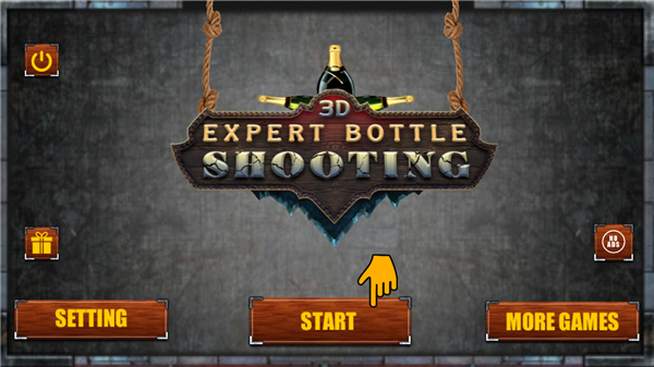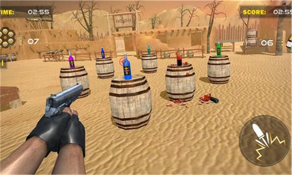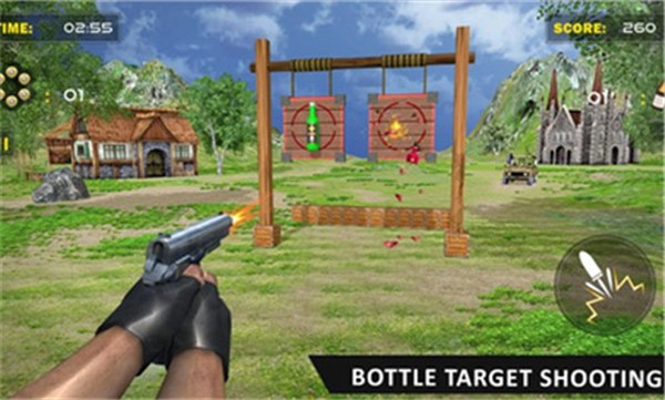 3、玩家需要在游戏中操作角色并且直接瞄准射击在场景中摆放在不同位置上的瓶子。