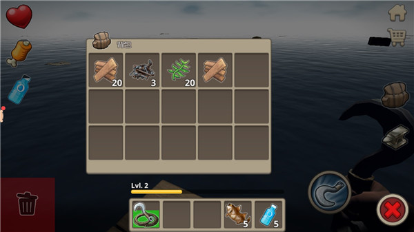 玩家在进入水下狩猎季游戏后,处于一块2×2的小木筏上,除了手里的钩子再无他物。玩家需要收集顺着海水漂浮而来的各种材料