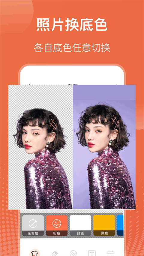 支持更换证件照底色,多种背景色可选;还支持自定义背景,选取自己喜欢的照片作为背景