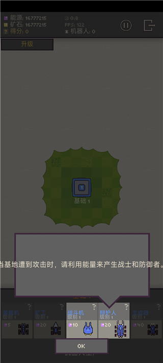 3、当基地遭到攻击时,可以利用能量来产生机器人战士和防御者;