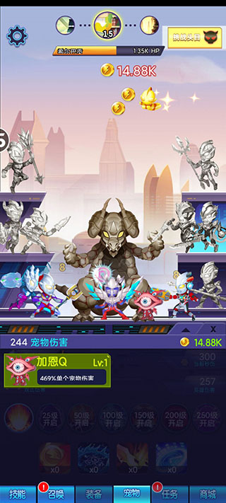 这款游戏中是可以获得怪兽宠物的,宠物需要奥特曼击败怪兽后才有几率获得,第一个宠物大概是在赛罗5级的时候击败怪兽得到的加恩Q,每个宠物都有强力的技能,加恩Q的技能是对一个怪兽造成469%的伤害。