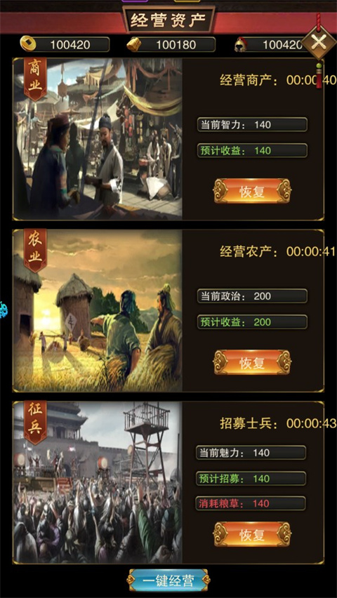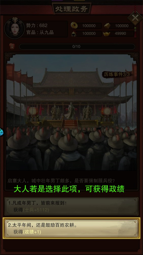 7、需要处理政务,玩家需要按照题目来选择不同选项;比如,城中壮年男丁颇多,是否要强制服兵役,可以选择两种不同的选项,所获得的经验也不同;