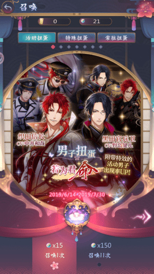3、绊石召唤:消耗帮助其他巫女或参加宴会获得的绊石,与1-3星的男子们及觉醒材料相遇