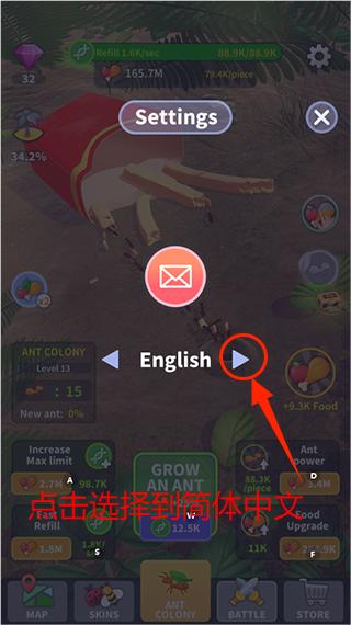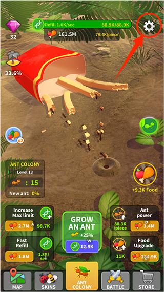1、下载并打开小小蚁群中文版,进入游戏点击右上角的设置选项。