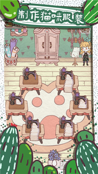 3、之后回到当初的界面,选择猫咪模特然后进行服装穿戴,之后就会有客人源源不断的前来挑选,在经营过程中,每出售一件衣服便可赚取小鱼干,来兑换新的图纸啦!