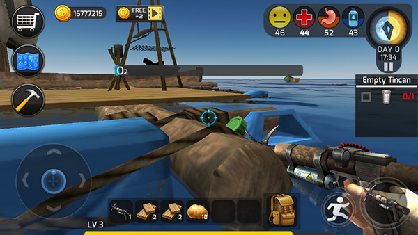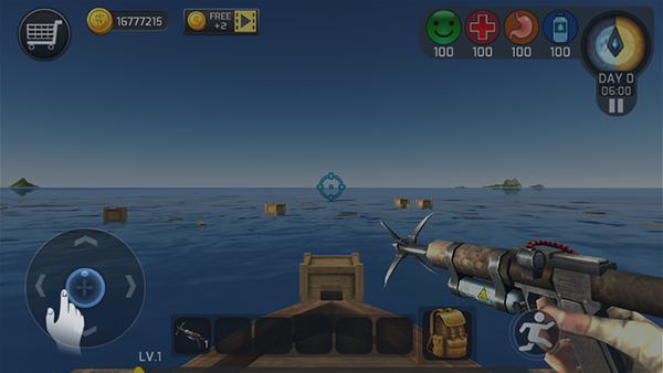 最初资源有限,需要利用钩爪获取资源,有时候还能遇到各种小岛屿,利用船锚使木筏停下来,建造一把斧头可以上去采集更多的资源,后期实力强大起来,可以通过安装捕网道具在海面上能更被动化的获取资源。