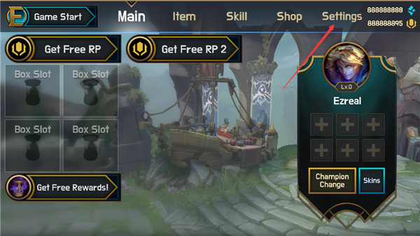 1、首先进入游戏,进入游戏后可以看到在游戏界面上有许多的选项,点击游戏界面右上角的“Settings”选项;