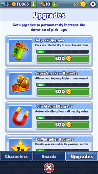 玩家们在游戏中会收集众多金币,可以利用这些金币到游戏商店中购买技能和道具,道具主要有加速、磁铁、滑板等。