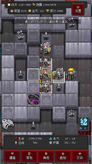 随着物资收集,在自己有能力守家以后可以在合适的地方建基地,此时要注意家中的规划,不能将东西随便乱摆不然发展以后会很麻烦,建议生产区和合成区分开,工作区就一个L型的地区就可以了,毕竟游戏道具有限。前面挖的矿可以做一点防御,晚上刷怪荣誉会很多,可以直接升级血量什么的(这里面技能是王道)基础攻击力不强,