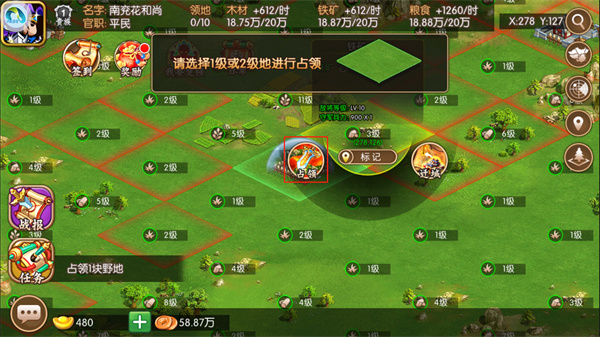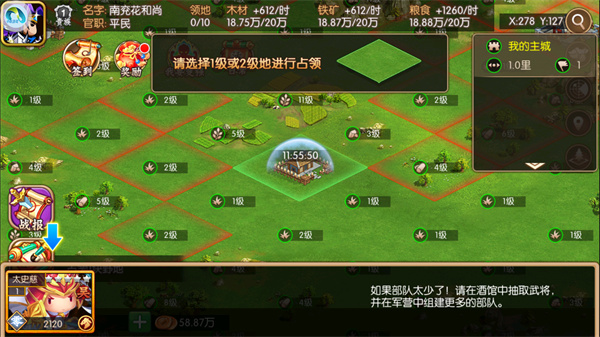 9、玩家需要派遣军队去占领野地,但是每个野地都有等级,玩家需要根据自己的等级来判断是否占领的了;