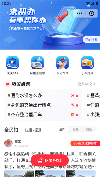 “帮办”是佛山+客户端推出的政民互动平台,依托佛山传媒党媒属性,整合“小强热线”“民生直通车”“天天315”“梁心帮办”等民生品牌栏目资源,用户可以通过全民拍、一键报料等功能,参与报料求助和社会治理。同时,“帮办”平台打通各栏目后台数据,提高解决问题的效率,带动政民互动效能提升。