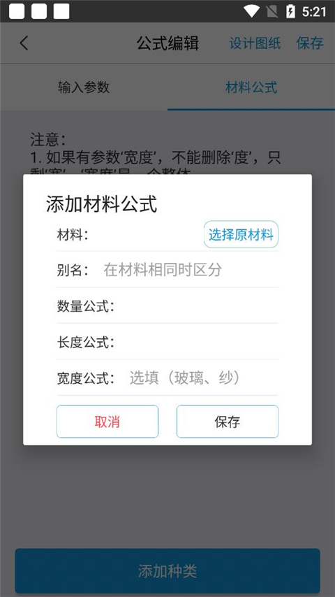 3、点击添加种类,可以添加不同的原材料以及长宽公式。