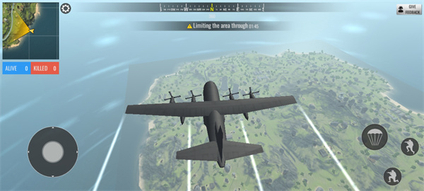 3、进入游戏如图,玩家将乘坐飞机进行大逃杀,点击右下角降落伞按钮;