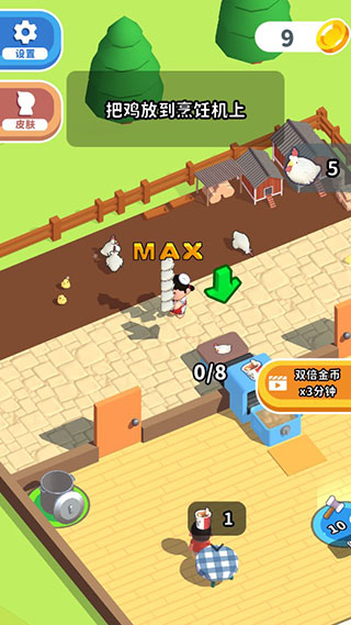 4、有了烹饪机和桌子,现在我们无抓些鸡,一次只能抓5只,抓好后我们把鸡放到烹饪机上。