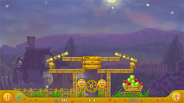 第三关:利用跷跷板原理,用轮子把橘子砸到左边的坑,用箱子封上。