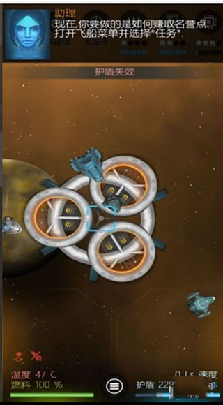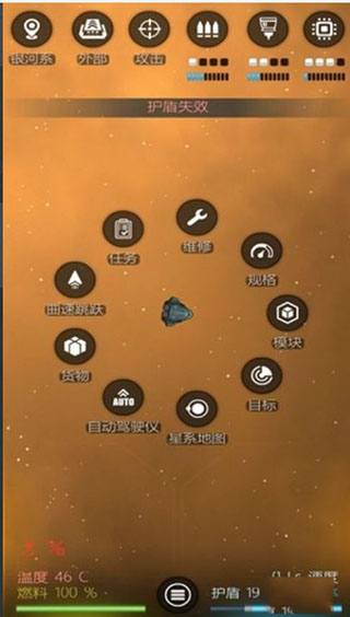 状态:护盾离线状态,在被攻击到后护盾值归0且被打到舰体,右下白色护盾条变灰,需要较长时间重新上线,在未恢复前护盾值不起防护作用。