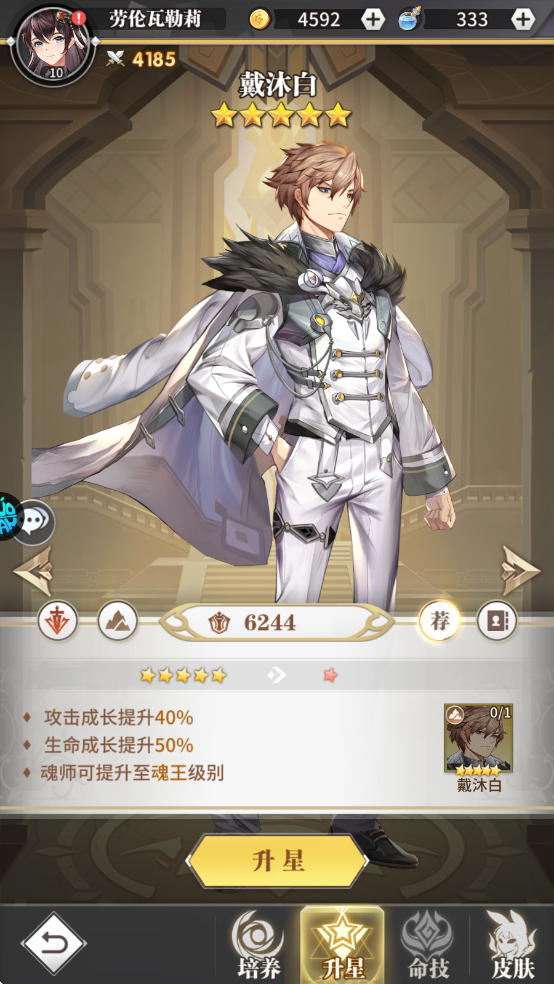 通过吸收魂师整卡材料进行升星,不同星等的升星需要不同的整卡。每次升星可提升魂师级别,并增加魂师攻击成长和生命成长的提升。