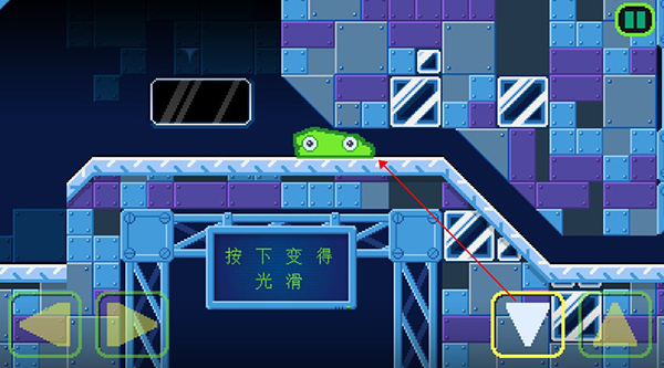 玩家在碰到无法直接过去的狭窄道路时,可以按下收缩键也就是倒三角按钮,史莱姆就会压缩变矮,就可以通过啦。