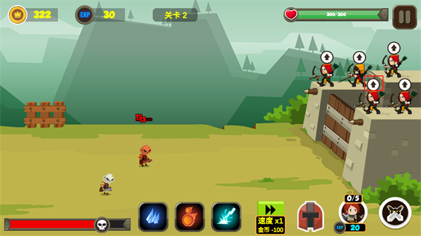堡垒保卫战游戏中玩家可以滑动屏幕来进行场景移动,通过点击游戏下方的英雄图标来进行英雄召唤,每召唤一个英雄需要消耗一定的经验,游戏下方还有三个技能,玩家可以利用技能来消灭敌人,游戏中英雄还可以进行升级,玩家可以点击上箭头即可进行升级,将所有的敌人击败后即可通关,通关后玩家可以点击下一关进行闯关。