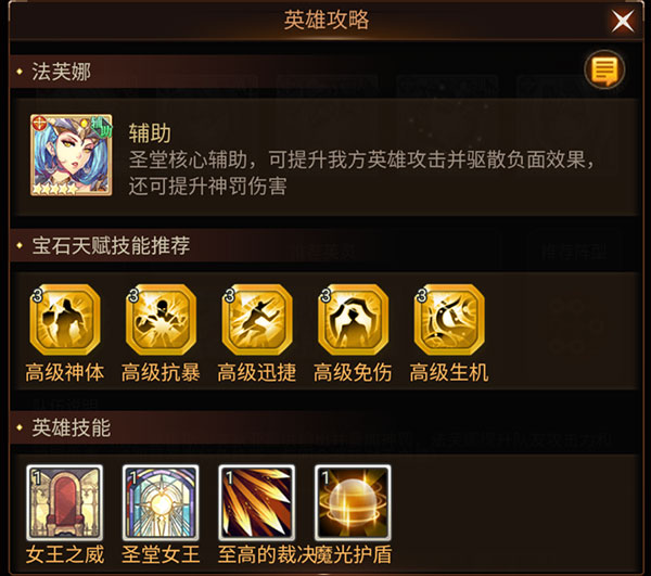 圣堂核心辅助,可提升我方英雄攻击并驱散负面效果,还可提升神罚伤害。宝石天赋技能推荐带高级神体、高级抗暴、高级迅捷、高级免伤、高级生机。