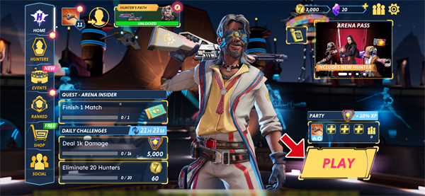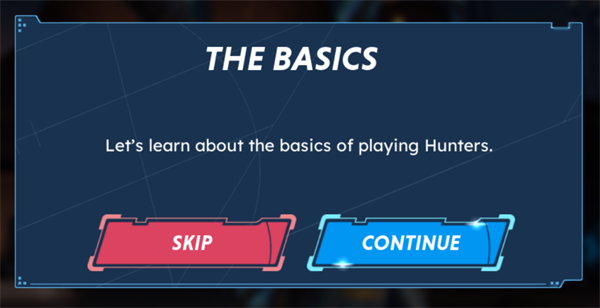 创建账号后,你会进入一个简短的新手教程。你会在此处学习基本玩法,并浏览菜单来查看猎手详情,然后就可以开始对局了。你可以点击跳过按钮来跳过新手教程。
