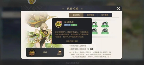 如上图所示,离春普攻概率三连击,2星开启攻击必中,3星开启连击增伤,最关键的是6星开启击杀再动,在pvp中可以舒适收残血!因为离春本身靠普攻打伤害不需要怒气,所以每回合都能概率打出高伤害,并且可以很好的应对怒气削减的战局,例如:铺山的被动是受击概率减怒,那对于离春来说,是无效的。攻击必中对于闪避属性的敌人也是天克,敌人闪避再高也没用。