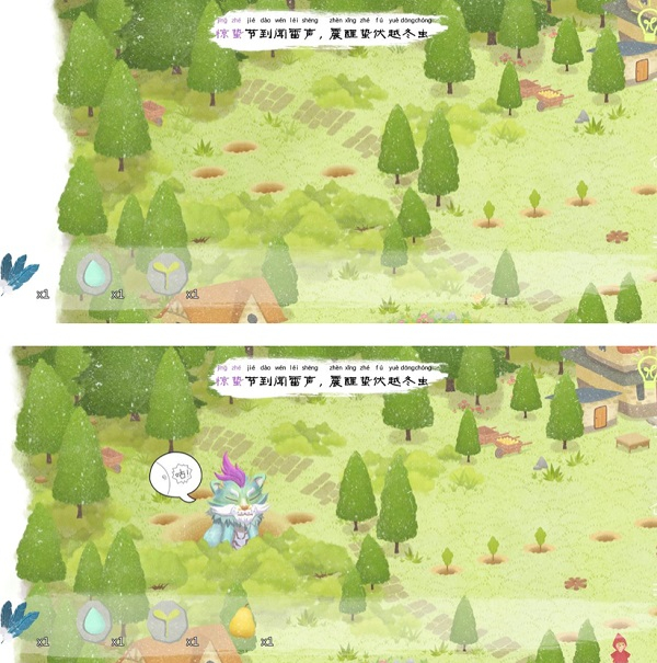 游戏里有很多有趣的细节,比如可以点击乌云让雨停,或者用木棍去灭火。还有一些小动物和植物,比如惊蛰的小洞穴旁边有梨子树,这些都能增加解谜的乐趣。地图设计也很用心,每个章节都有不同的场景,玩起来不会觉得单调。