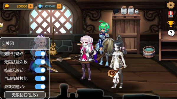 地下城与公主2是一款像素风格的地下城冒险游戏,游戏有十几个不同的少女角色等你解锁陪你一起去冒险,在地下城的世界之中有很多的boss存在,想办法击杀他们就能获取奖励,继续后续的旅途了,玩法非常有趣,探索各种随机地牢,收集更多的角色,有人类公主、吸血鬼弓箭手,不死白魔法师、龙族骑士等等。游戏中玩家可以不断提升战斗力,通过升级获得更高技能属性,在行动的时候采用走格子的方式,在战斗的时候采用的是超快节奏的手动施法模式,高度自由的战斗玩法,再加上开启三倍速,完成任务获得奖励不浪费时间,玩家随时都能来一局。超级精彩的剧情故事,还能不断刷怪升级,这款游戏中超多的游戏内容可以体验,更有超多的关卡可以挑战。地下城与公主2高级版内置修改器版,游戏内置作弊菜单,修改无限移动点、无限血量、无限行动点、无限技能次数、技能无冷却、自动释放技能、游戏加速三倍以及无限钻石等,玩家可以用无限钻石购买无限金币,在商店中解锁各种装备和道具!