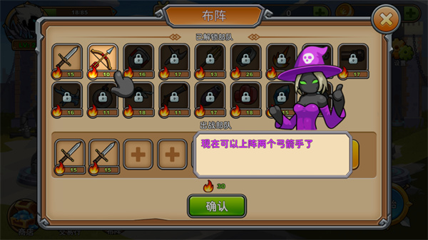 3、再点击所需要的兵种添加到出战部队中,点击确认即可完成布阵。
