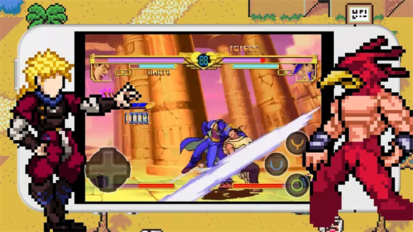 12、程序类串联攻击:↓↙←+S(可蓄),发动后敌我双方都会定住(不能移动),而发动者此时可在限定时间内自由输入各种不同的攻击,在限定时间完结后,发动方就会依照刚才输入的指令向对手展开攻击。注意程序类串联攻击在输入↓↙←+S后是可以按住S不放来延长串联攻击指令输入时间的,不过延长的时间段内对手是可以自由活动的,所以意义不大。