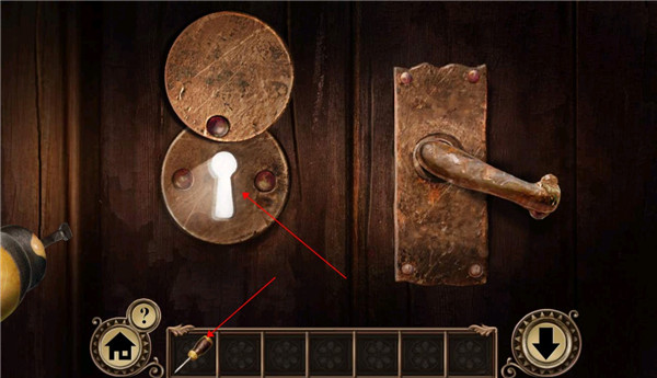 3、点击房间门把手,将钥匙洞贴片滑到上面,提示钥匙在外面我们返回
