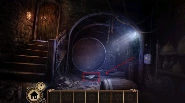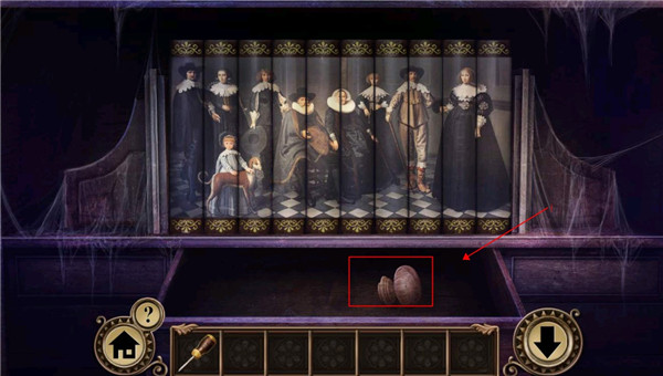 9、回到大厅往前走,点击右边的书架将刚才获得的书,放进去,然后调整书的顺序使上面的画拼接完整,获得抽屉把手